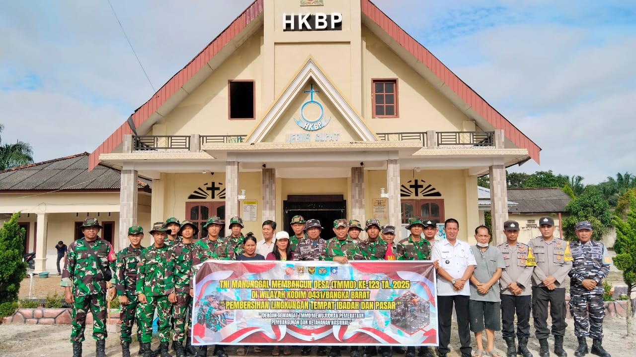 Bangka Barat,viralperistiwa.com-Untuk mendukung program TNI Manunggal Membangun Desa (TMMD) ke-123, Kodim 0431/Bangka Barat bersama masyarakat, personel Polri, dan Angkatan Laut Dan juga beberapa personil dari Batalyon 147/KGJ menggelar aksi pembersihan gereja HKBP di Desa Puput Kecamatan Parittiga Kegiatan ini merupakan bagian dari upaya meningkatkan kebersihan, kenyamanan, serta mempererat kebersamaan antarwarga dan aparat.pada hari Rabu 26/02/2025