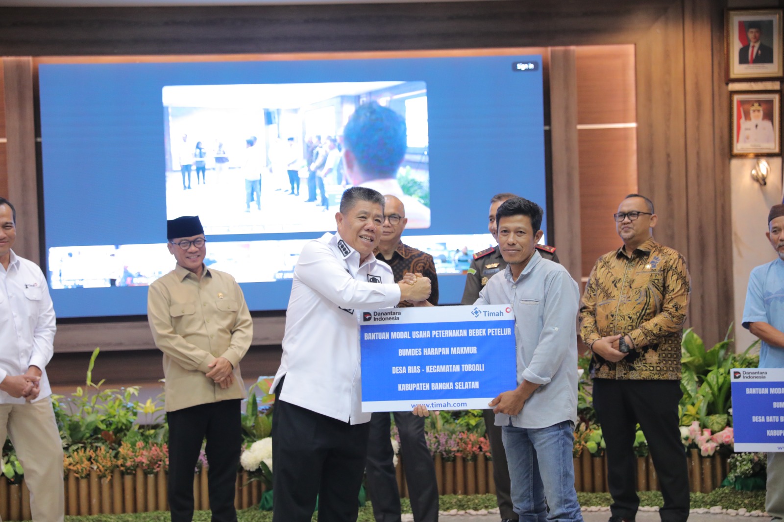 Tampak hadir juga Direktur Umum PT Timah Tbk Restu Widiyantoro yang dalam acara tersebut menyerahkan pemberian Corporate Social Responsibility (CSR) perusahaan Kepada Kepala Desa Tahun 2025.