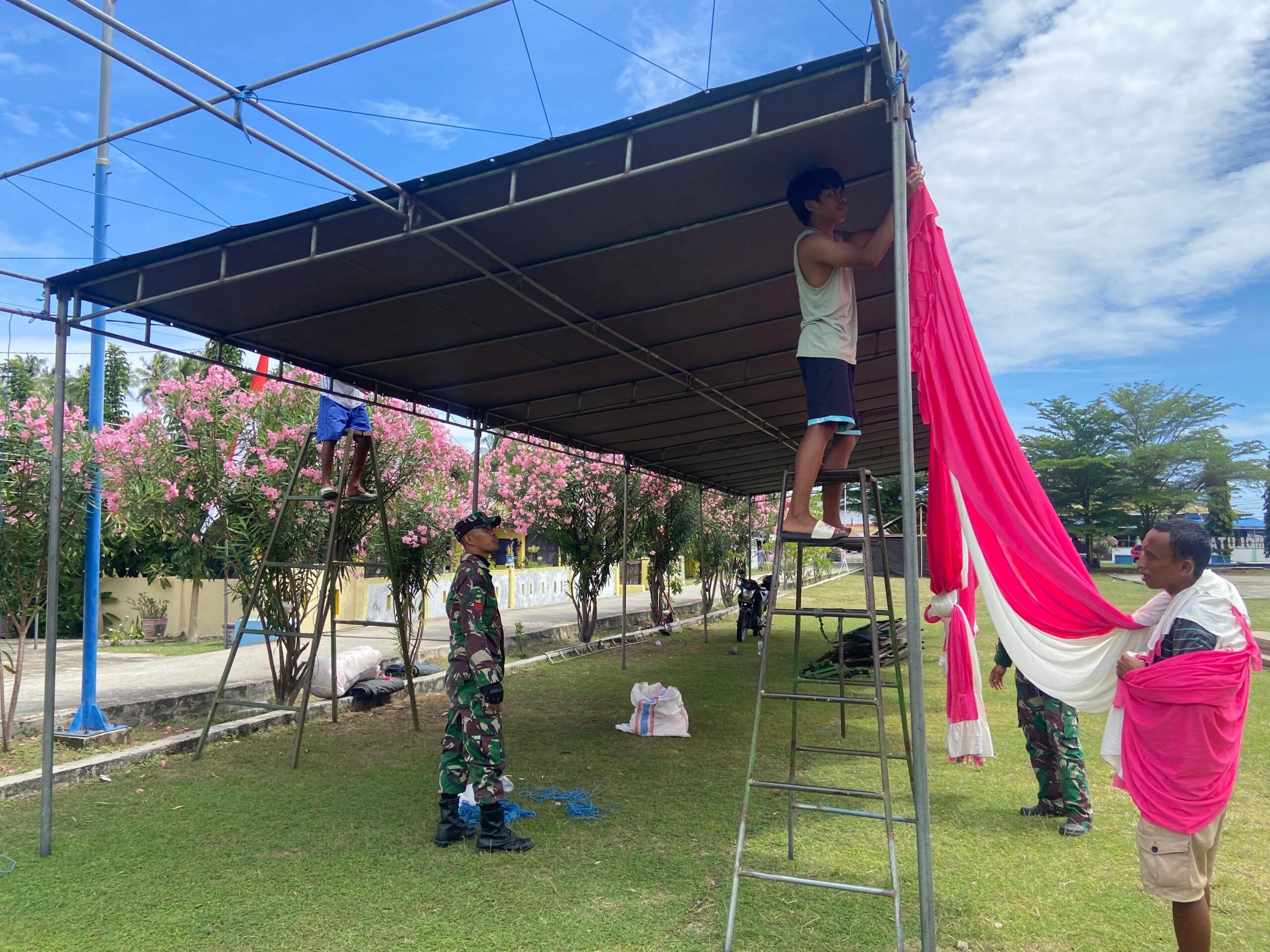 Pemasangan tenda ini merupakan bagian dari persiapan teknis untuk memastikan acara penutupan berjalan lancar dan nyaman bagi seluruh peserta. Serma Tomelo beserta anggota TNI dan warga setempat bekerja sama menata lokasi acara, mulai dari pengangkutan material hingga pemasangan tenda.