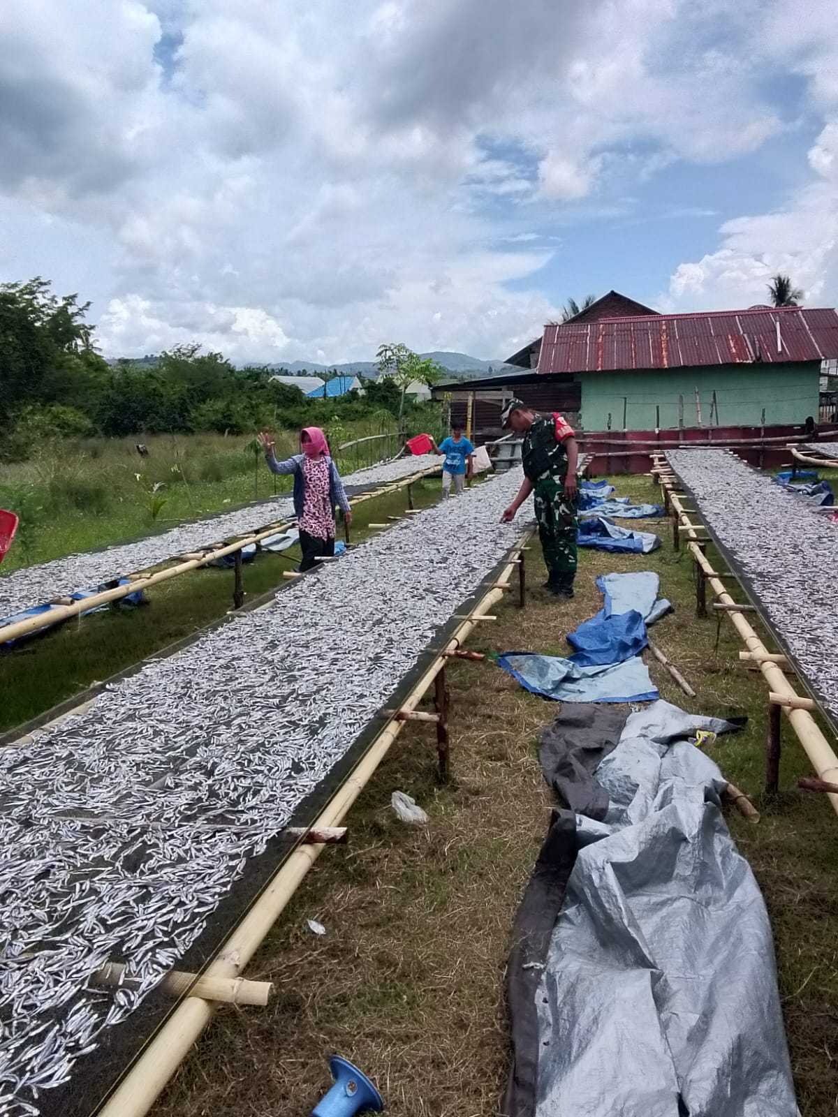 Babinsa 1314-01/Kwandang Bantu Penjemuran Ikan Teri Milik Nelayan Desa Ilodulunga