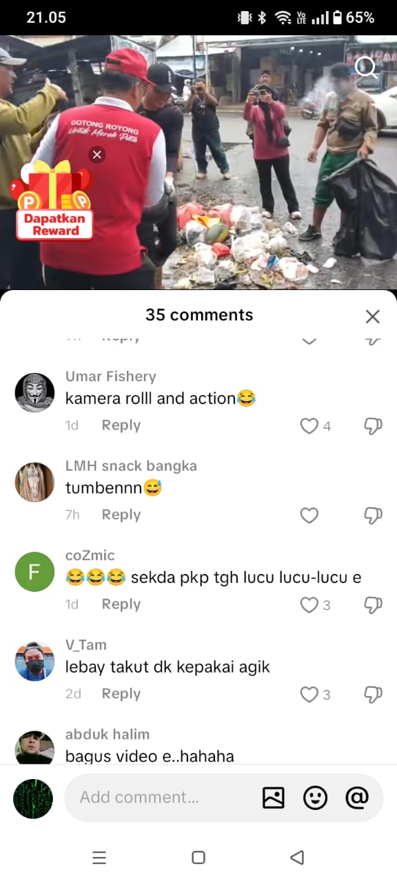 “wew ea bru keliat ea… mutek sampah.. depan rumah ya sapu pak. jgn nyuruh anak buah ea nyapu ea… pantang mundur seblm dpt muka 2…mutek sampah prioritas bai buat cairin kinerja,” komen akun salah satu netizen di tiktok.