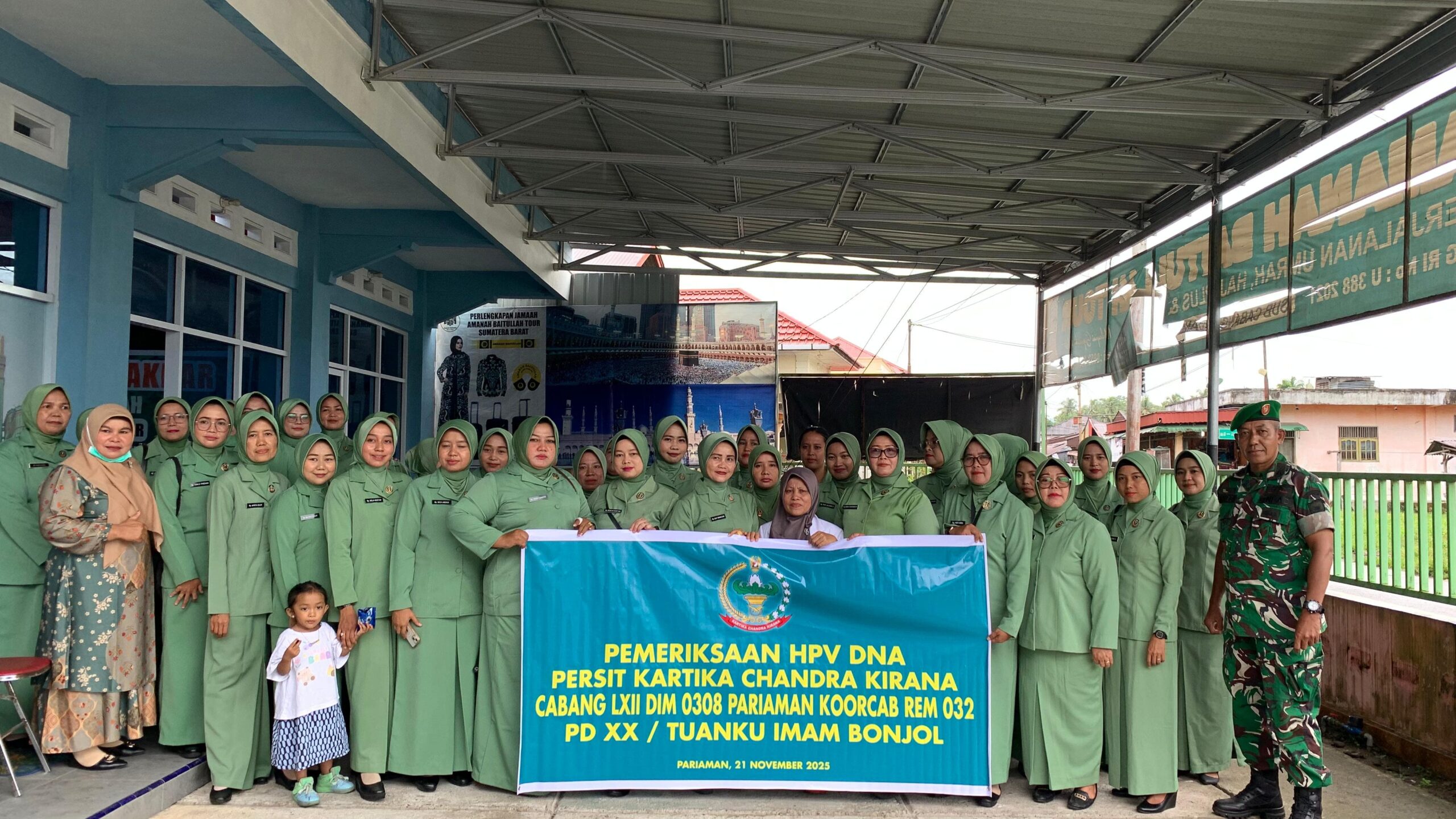 Padang Pariaman, viralperistiwa.com — Persit Kartika Chandra Kirana (KCK) Cabang LXII Dim 0308/Padang Pariaman Koorcab Rem 032/Wbr melaksanakan kegiatan pemeriksaan HPV DNA sebagai upaya deteksi dini kanker serviks, bertempat Klinik Mandiri dr. Hj. Erlina, M.P.H., di Kecamatan Nan Sabaris, Pasar Pauh Kambar, Kabupaten Padang Pariaman, Jum’at (21/11/2025).