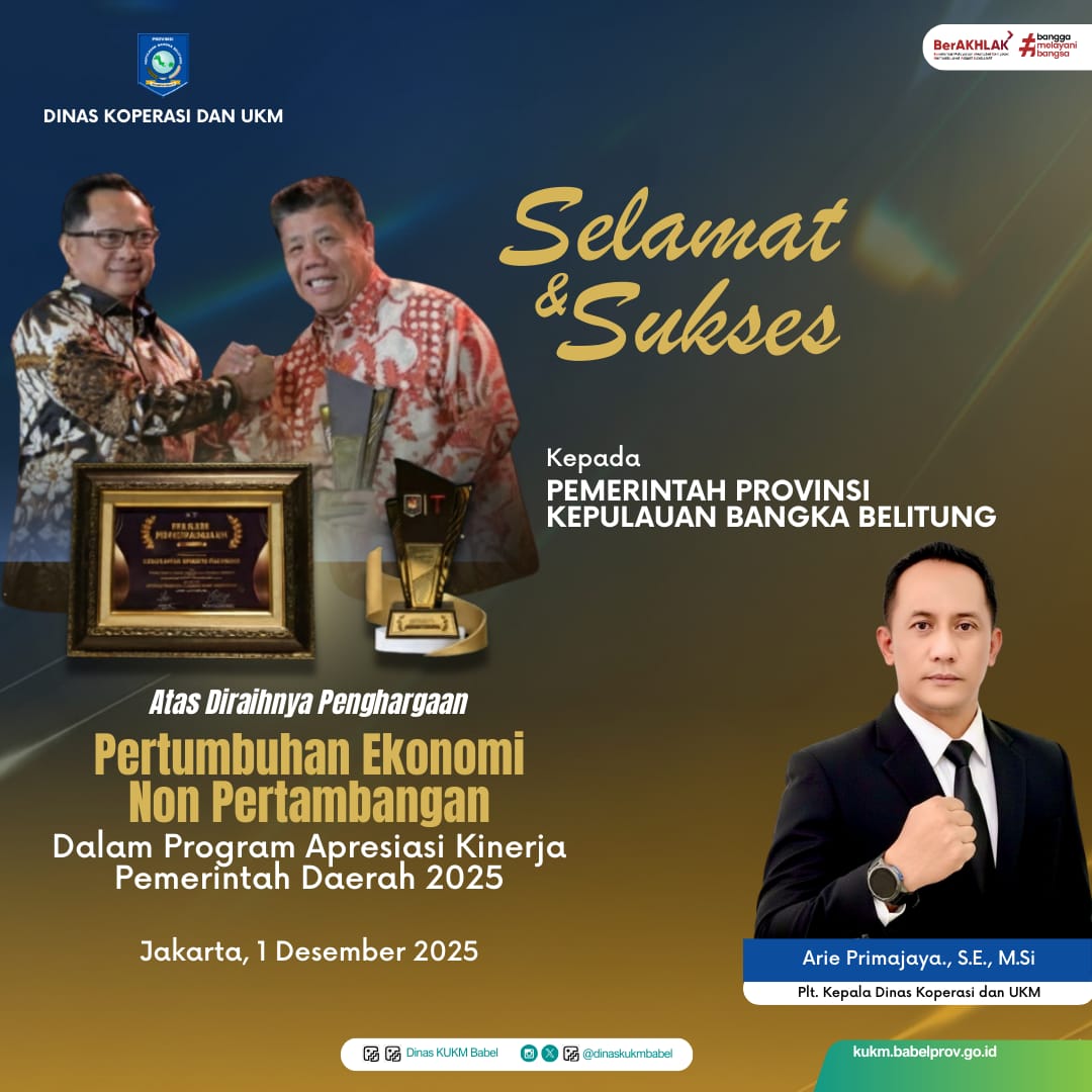 Pangkalpinang, viralperistiwa.com – Dinas Koperasi dan UKM Provinsi Kepulauan Bangka Belitung, melalui Plt. Kepala Dinas Arie Primajaya, S.E., M.Si, menyampaikan ucapan selamat dan apresiasi yang tinggi kepada Pemerintah Provinsi Kepulauan Bangka Belitung atas keberhasilan meraih Penghargaan Pertumbuhan Ekonomi Non-pertambangan dalam ajang Apresiasi Kinerja Pemerintah Daerah 2025 yang diselenggarakan di Jakarta pada 1 Desember 2025.(01/12/2025)