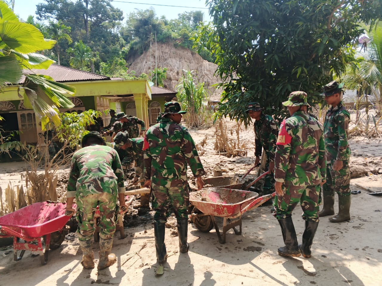 Banjir yang terjadi akibat tingginya curah hujan telah menggenangi pemukiman warga dan menyebabkan lumpur serta material terbawa arus masuk ke rumah-rumah penduduk. Melihat kondisi tersebut, personel Kodim 0308/Pariaman dan Yon TP 844 bergerak cepat untuk memberikan bantuan.