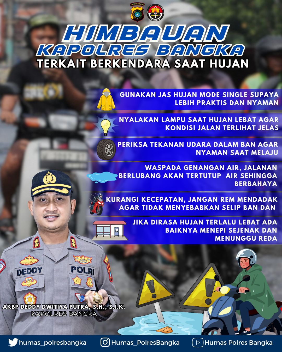Melalui pesan resmi yang disampaikan jajaran Humas Polres Bangka, Kapolres menekankan pentingnya penggunaan jas hujan mode single agar pengendara tetap nyaman dan tidak terganggu saat berkendara. Selain itu, ia juga mengingatkan agar lampu kendaraan wajib dinyalakan, terutama ketika hujan deras, untuk memastikan visibilitas pengendara maupun pengguna jalan lainnya tetap terjaga.