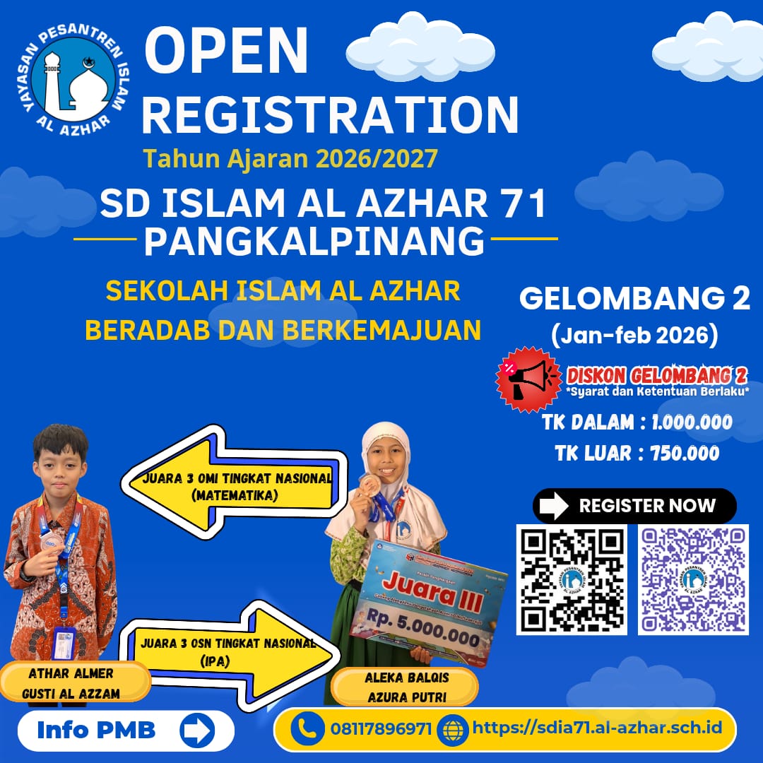Dengan dibukanya PPDB Gelombang 2 ini, Al Azhar Pangkalpinang mengajak masyarakat untuk bergabung dalam lingkungan pendidikan yang menanamkan adab, akhlak, kecerdasan, dan kesiapan masa depan.