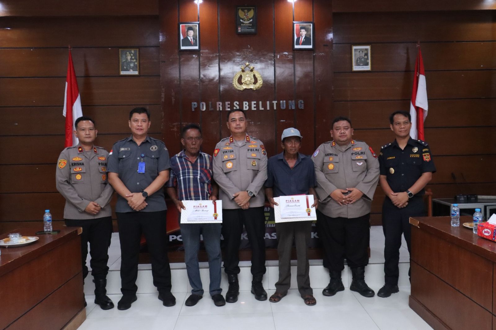 Penghargaan tersebut diberikan dalam kegiatan tatap muka yang berlangsung di Aula Tribrata Polres Belitung, Jumat (27/3/2026). Dua nelayan penerima penghargaan tersebut yakni Hasan Basri dan Abdul Manap, yang telah menunjukkan kepedulian serta keberanian dengan melaporkan temuan narkotika kepada pihak kepolisian.