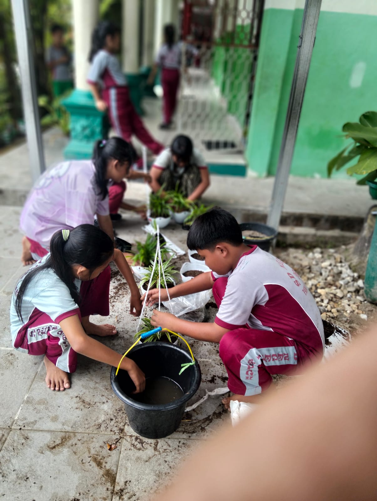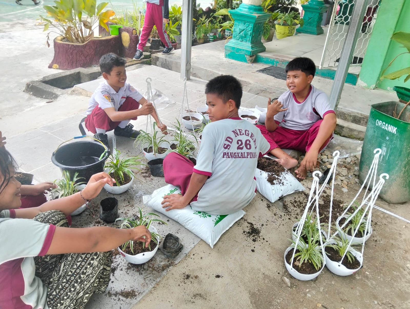 Selain itu, siswa juga diajak untuk menanam tanaman hias di area sekolah. Dengan penuh antusias, mereka mengisi pot dengan tanah, menanam bibit, serta menyusun tanaman agar mempercantik lingkungan sekolah.